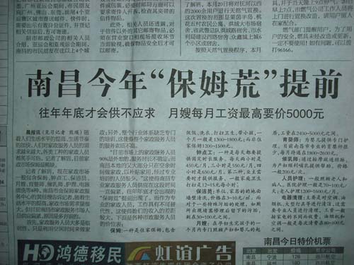 記者了解到,現(xiàn)在家政市場一般包含保姆、鐘點工、保潔員、月嫂、育嬰師、催乳師、護理、電器清洗等8種。南昌市金保姆家政服務中心的黃經(jīng)理告訴記者,隨著生活水平的提高,家政市場需求量很大。但目前南昌市家政服務市場人員供應偏緊,原因是多方面的。